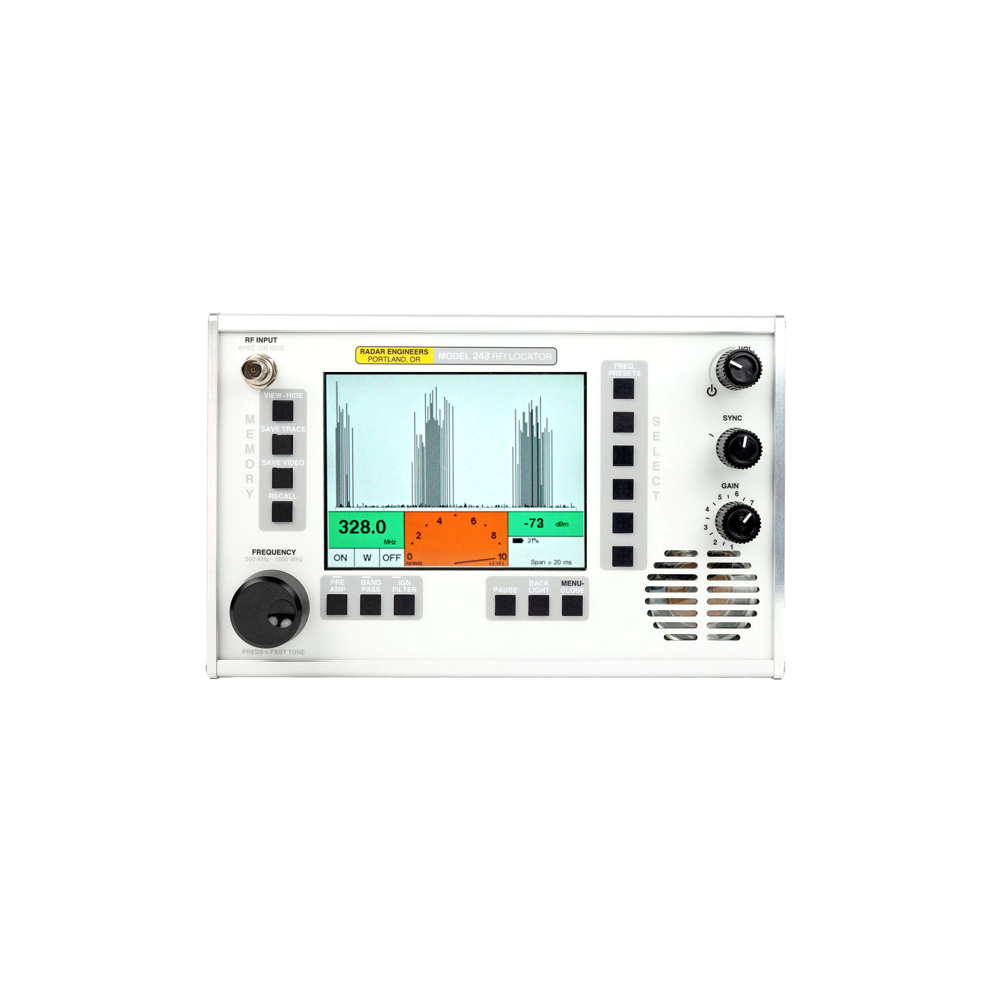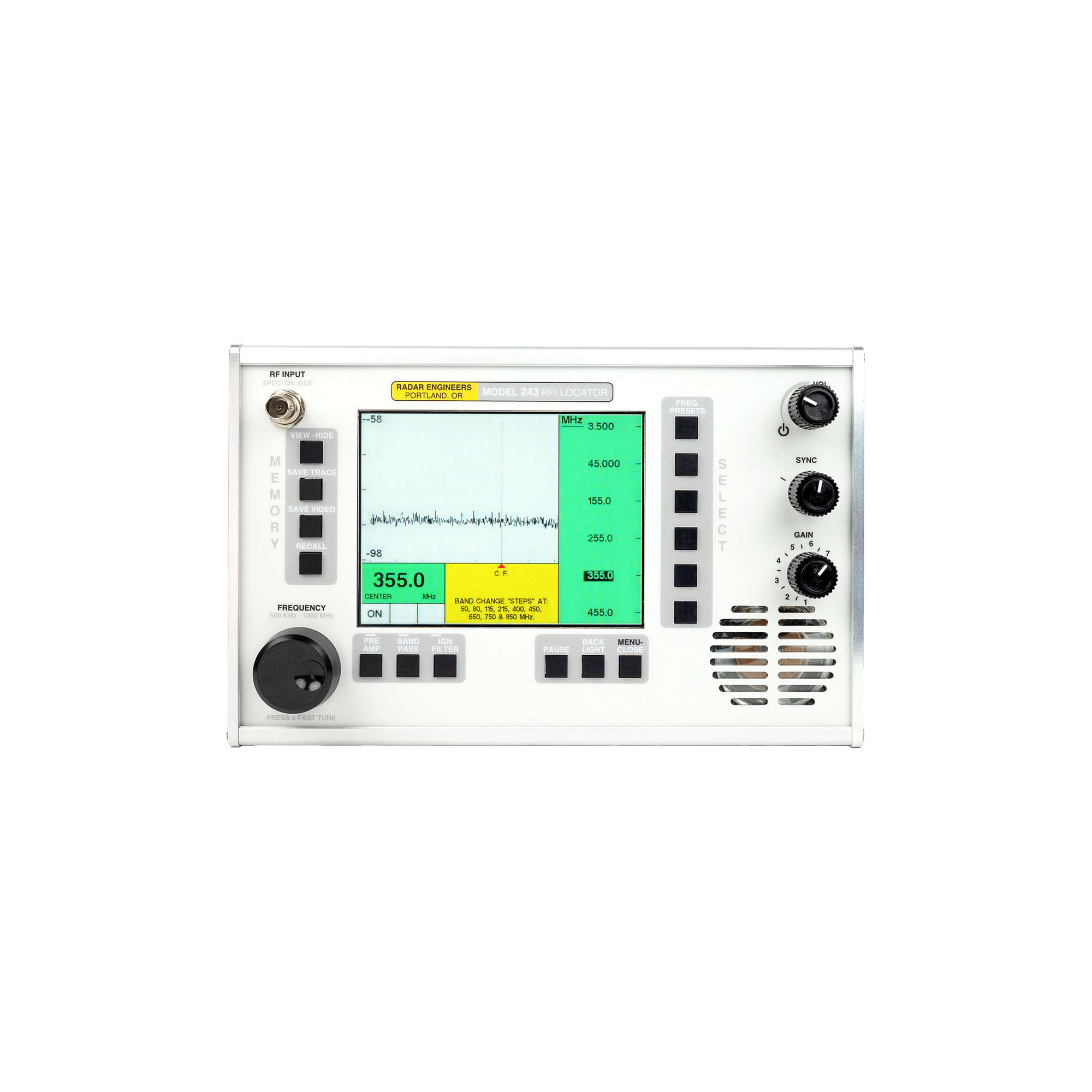 - Frequency: 500 kHz – 1000 MHz Synthesized Tuner