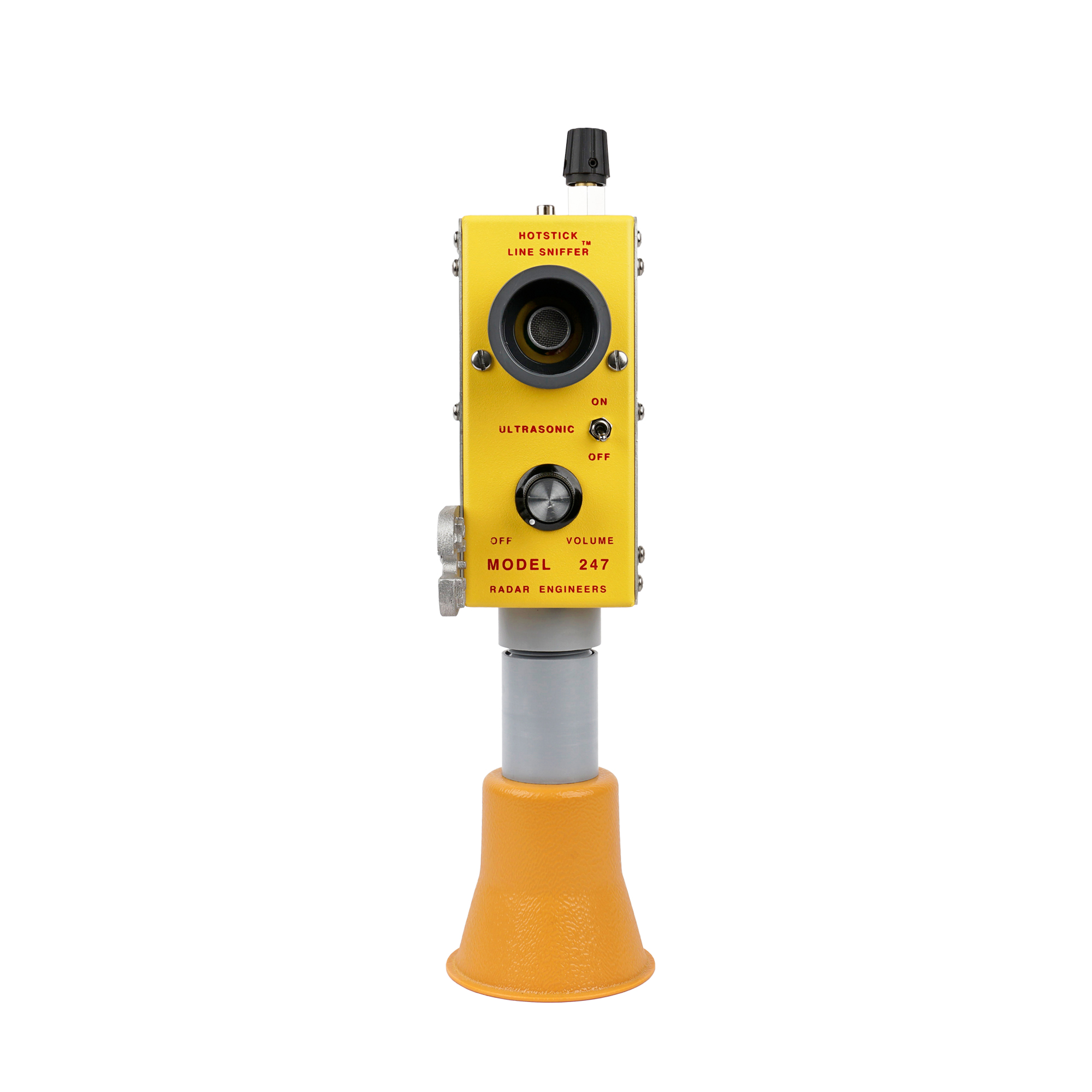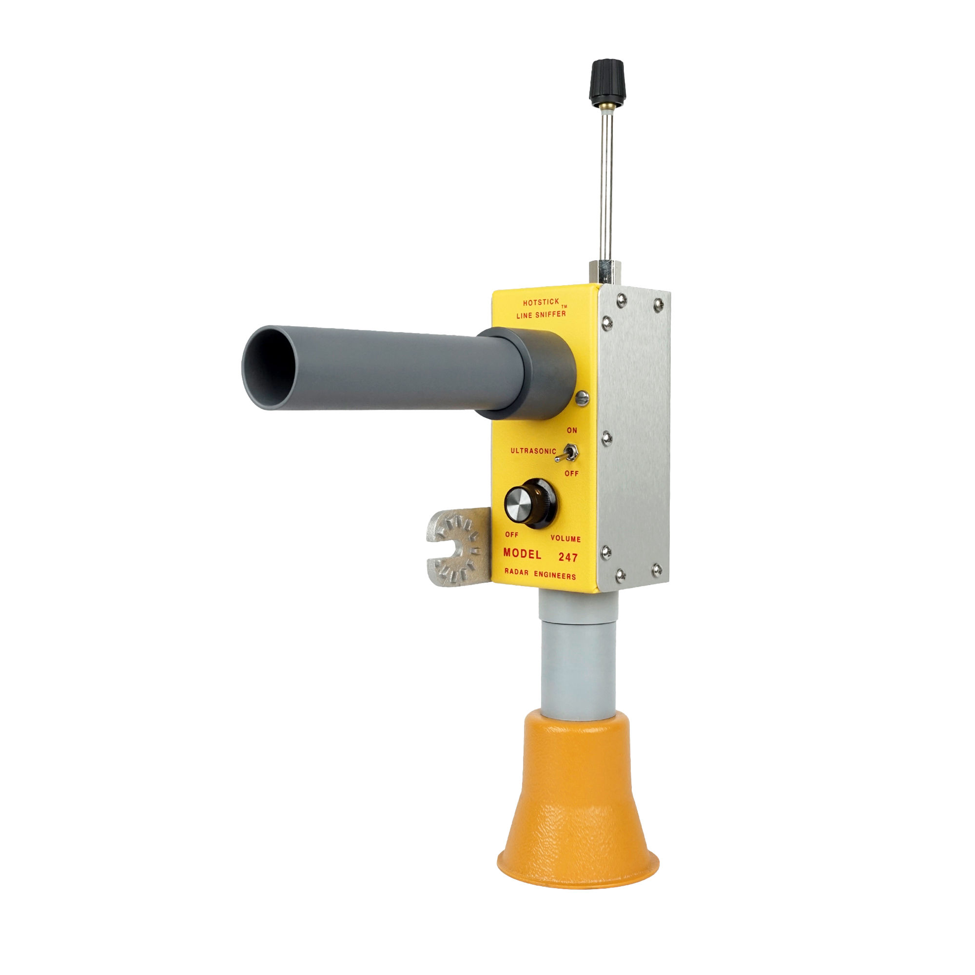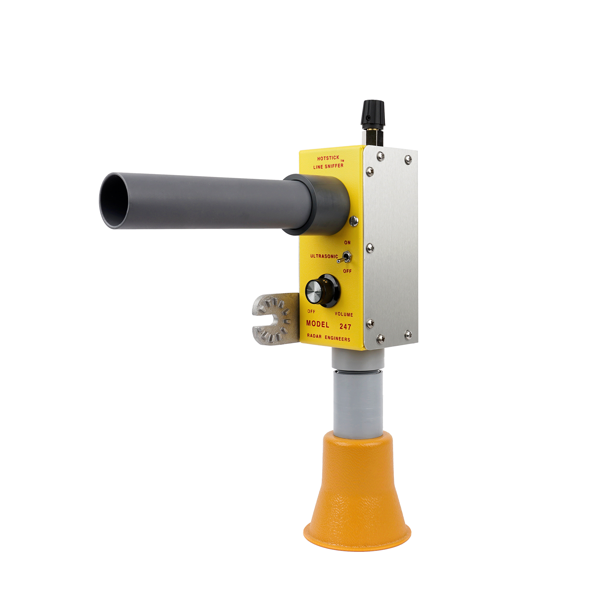 Fully self-contained and ready to mount on any standard hotstick via a universal adapter, the 247-B requires no headsets, external batteries, or auxiliary components. An integrated sounding horn provides immediate audible confirmation for verification and post-repair inspection. For initial pole identification over longer distances, complementary Radar Engineers locating instruments (such as the models 243 and M-331) are recommended prior to deploying the 247-B for close-range ultrasonic pinpointing.