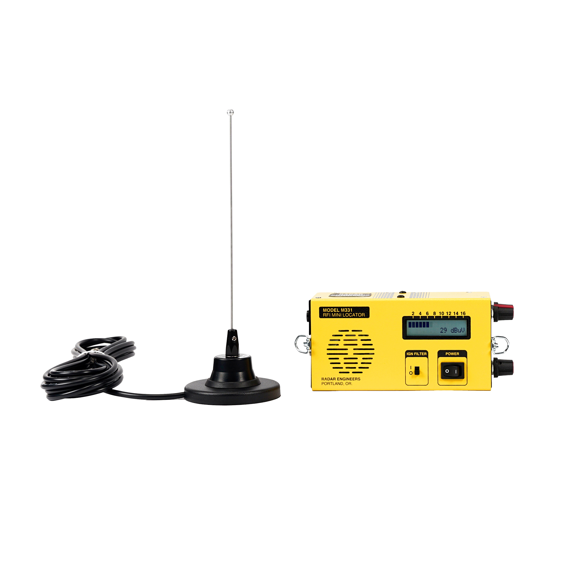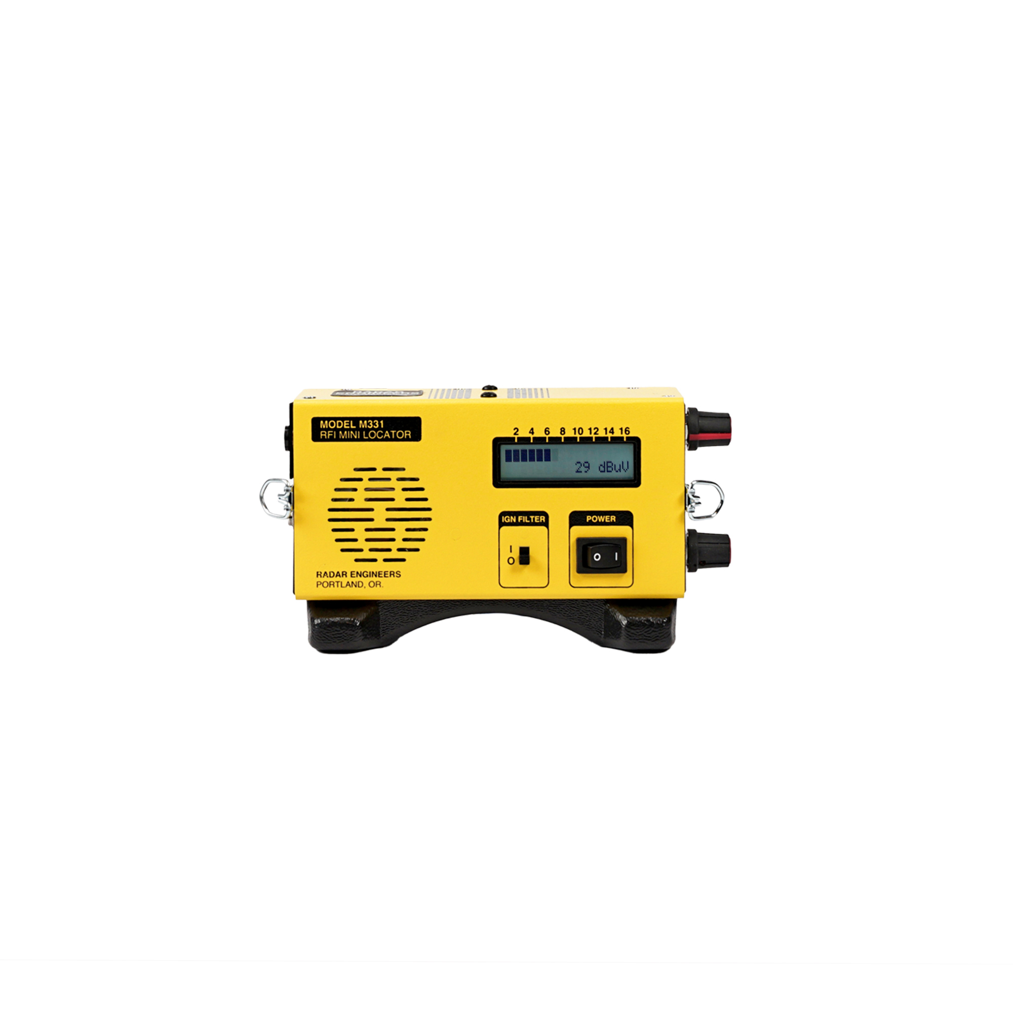 The M-331Y is a compact, easy-to-use RFI locator designed to detect power line sparking that causes radio and television interference. Built for field personnel, it combines a sensitive receiver, an LCD meter with bar graph and dB readout, a speaker, and two antennas: one for vehicle use and one for handheld operation.